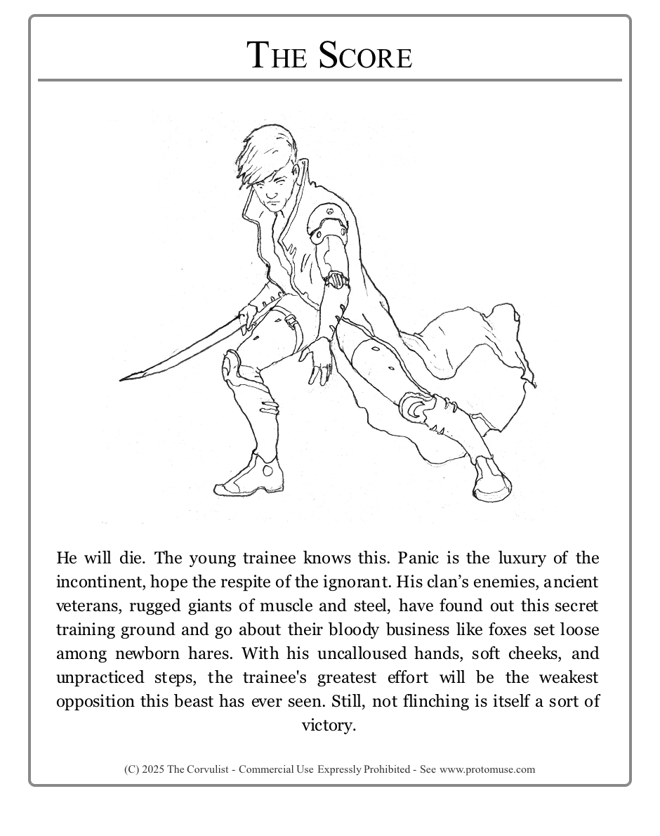 He will die. The young trainee knows this. Panic is the luxury of the incontinent, hope the respite of the ignorant. His clan’s enemies, ancient veterans, rugged giants of muscle and steel, have found out this secret training ground and go about their bloody business like foxes set loose among newborn hares. With his uncalloused hands, soft cheeks, and unpracticed steps, the trainee's greatest effort will be the weakest opposition this beast has ever seen. Still, not flinching is itself a sort of victory.